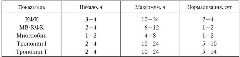 Лабораторные и инструментальные исследования. Из некротизированных кардиомиоцитов в кровь поступают миокардиальные ферменты. По активности и изменению содержания ферментов в сыворотке крови судят о наличии ИМ и сроках его возникновения. Среди многих энзимов, содержащихся в клетках сердечной мышцы, наиболее значимыми для диагностики ИМ считаются аспартатаминотрансфераза, лактатдегидрогеназа и креатинфосфокиназа. Помимо ферментов при ИМ в кровь поступают и другие содержащиеся в кардиомиоцитах соединения – в частности, миоглобин и сердечные тропонины. Среди основных маркеров некроза миокарда наибольшей специфичностью и чувствительностью обладает тропонин Т (табл. 1.22).
