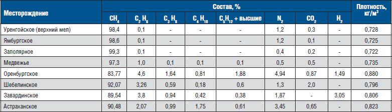 Таблица 1. Состав и плотность газов основных газовых месторождений