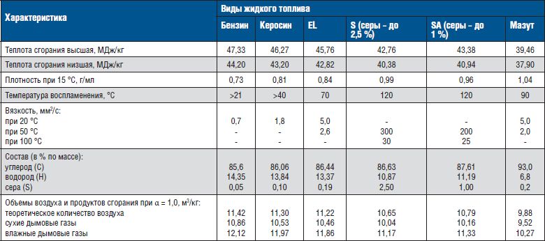 В табл. 4 приведены основные характеристики жидких топлив, на которые рассчитаны горелки и котлы поставщиков оборудования из Европы.