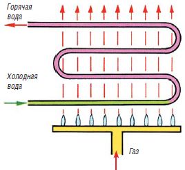 В проточном теплообменнике нагреваемая вода проходит однократно внутри змеевика сквозь поток греющей среды.
