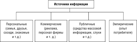 После осознания потребности у клиента возникает потребность в информации. Но очень часто потребность может быть решена сразу – чувство голода можно удовлетворить, например, горячей сосиской в тесте, которую продают на улице. Нам интересны те клиенты, у которых эти потребности имеют более широкий круг удовлетворения: не только насытить желудок, но и отдохнуть в приятном месте, пообщаться с друзьями, коллегами, послушать музыку, попробовать экзотические блюда и т. д. Поэтому информация именно об этом должна быть доступна потребителю. Для получения информации могут быть использованы следующие источники (рис. 2).
