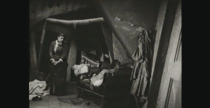 Образ мерзкой сгорбленной старушонки, изломанные линии, «говорящие» фактуры, например, паутина, затянувшая угол стены в сценах переживаний Раскольникова перед следствием, становящаяся участником действия. Это выразительное решение, но у Достоевского есть описание ощущения Раскольникова, пришедшего к старухе, которое, конечно, глубже и трагичнее: