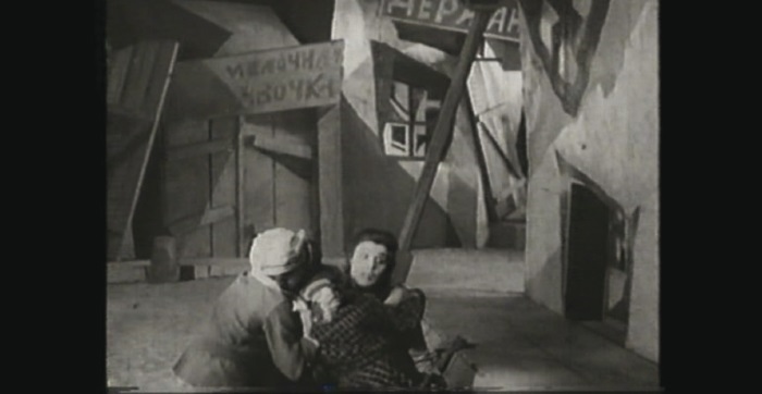 Улица, по которой Раскольников направляется к старухе-процентщице, представляет набор кубистических элементов, лишь напоминающих стены, лестницу, перила. А окна на стене дома – просто нарисованные прямоугольники разной неправильной формы. В ночной сцене, как мы видели уже в «Кабинете доктора Калигари», тени от фонарей нарисованы на полу павильонной декорации. А вот сцена романа: