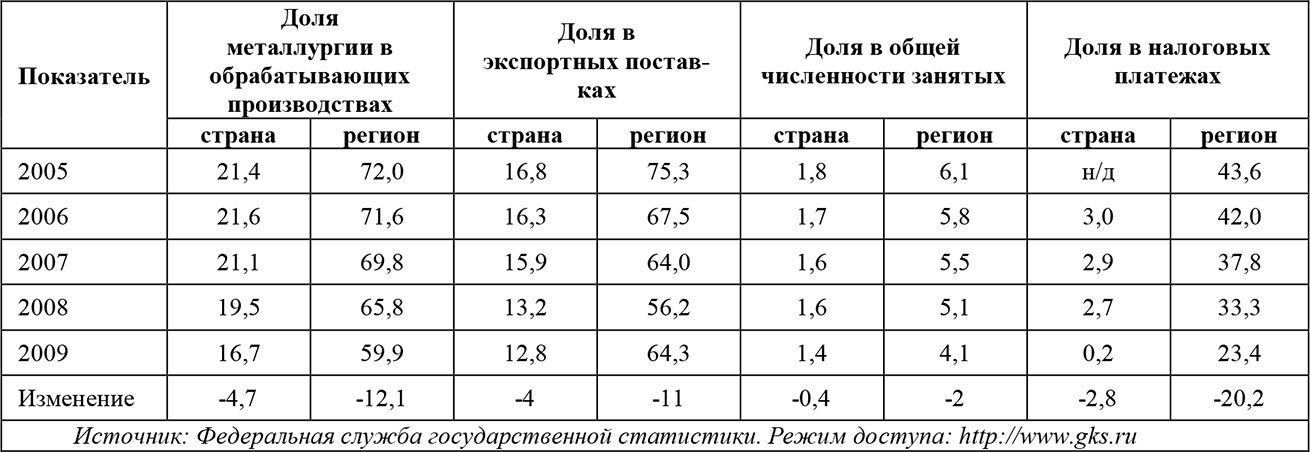 О. И. Попова[1]Научный руководитель – Кирик ОБ.[2]УРАН ИСЭРТ РАНЗначение отрасли черной металлургии в современной экономике определяется прежде всего тем, что она является главным поставщиком конструкционных материалов для предприятий ВПК, ТЭК, машиностроения, строительства. Металлургическая промышленность является одной из отраслей специализации России в современном международном разделении труда. Доля металлургии в промышленном производстве – 17 %, экспорте – 14,2 %, в налоговых платежах – 3 %. Россия по объему производству стали занимает 4 место в мире, а по экспорту металлопродукции – 3 место. На металлургическое производство приходится почти треть потребляемой отечественной промышленностью электроэнергии и пятая часть грузовых железнодорожных перевозок. В экономике Вологодской области металлургическому комплексу также отводится особая роль (табл. 1).