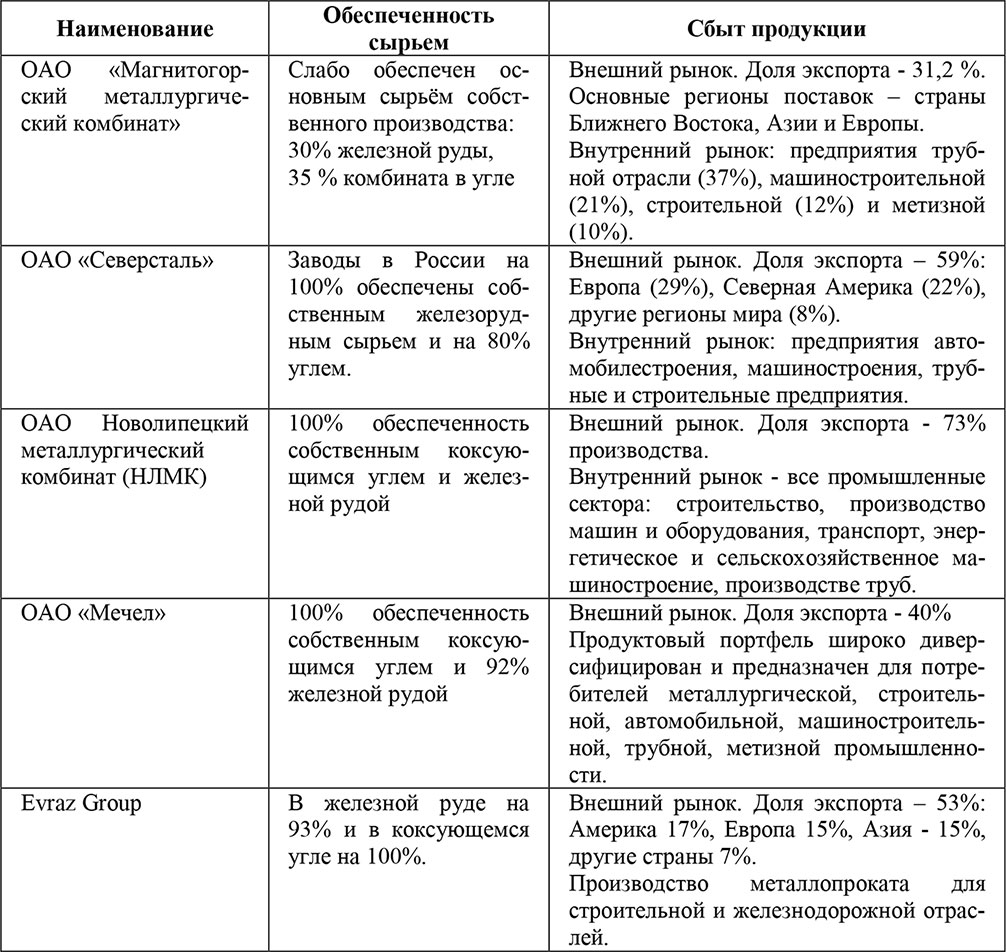 Приватизация металлургических заводов в 1990-е годы позволила российским компаниям нарастить дополнительные сырьевые, электрогенерирующие и производственные активы, что, в конечном счете, привело к формированию крупных вертикально-интегрированных холдингов, таких как Северсталь, Новолипецкий металлургический комбинат (НЛМК), Мечел, Магнитогорский металлургический комбинат, Evraz Group (табл. 1.2). Контроль над полным технологическим циклом, включающим добычу и обогащение руды и угля, производство металла нескольких стадий обработки, выпуск конечной металлопродукции с высокой добавленной стоимостью и утилизацию вторичных ресурсов, значительно повышает эффективность деятельности металлургической компании. Российские компании, располагающие богатой ресурсной базой и входящие в число ведущих поставщиков металлопродукции на мировой рынок, в итоге выигрывают и от роста цен на сырье, и от роста цен на конечную продукцию. [1]