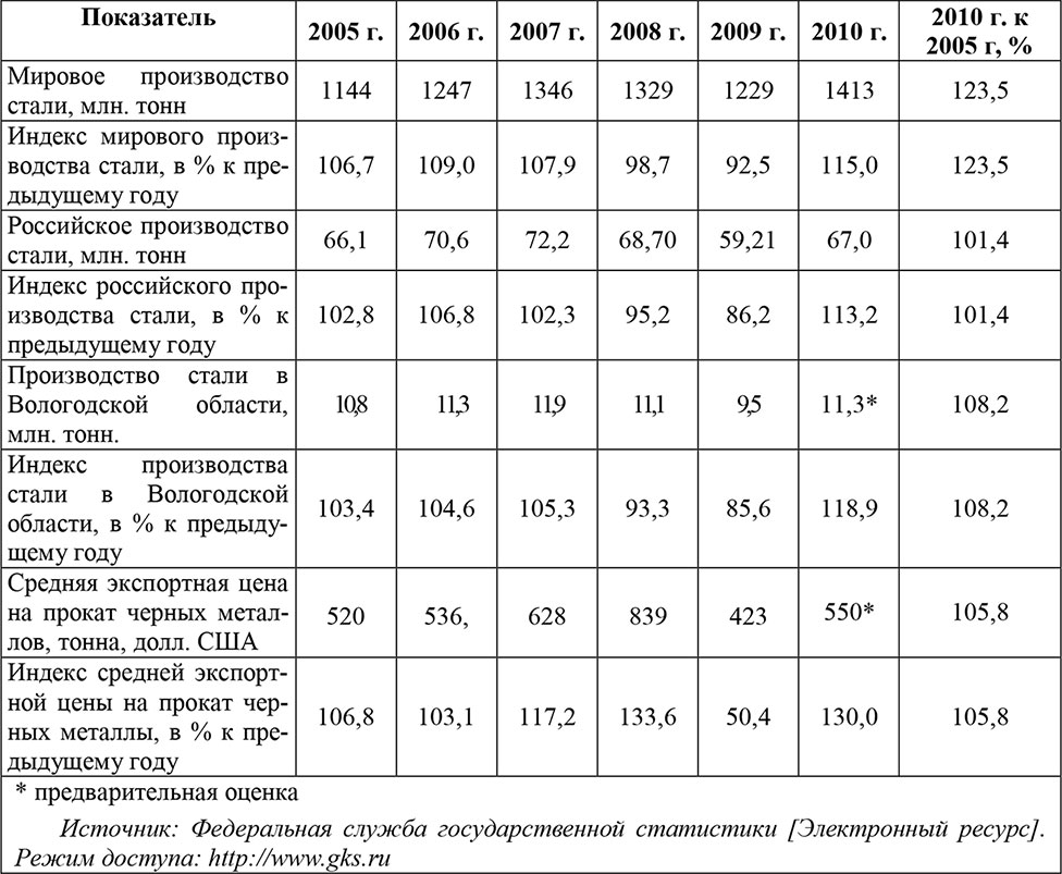 В период с 2005 по 2010 мировое производство стали выросло почти на четверть, российское – на 1 %, в Вологодской области – на 8 %, средние экспортные цены на черные металлы за исследуемый период выросли на 6 % (табл. 3).