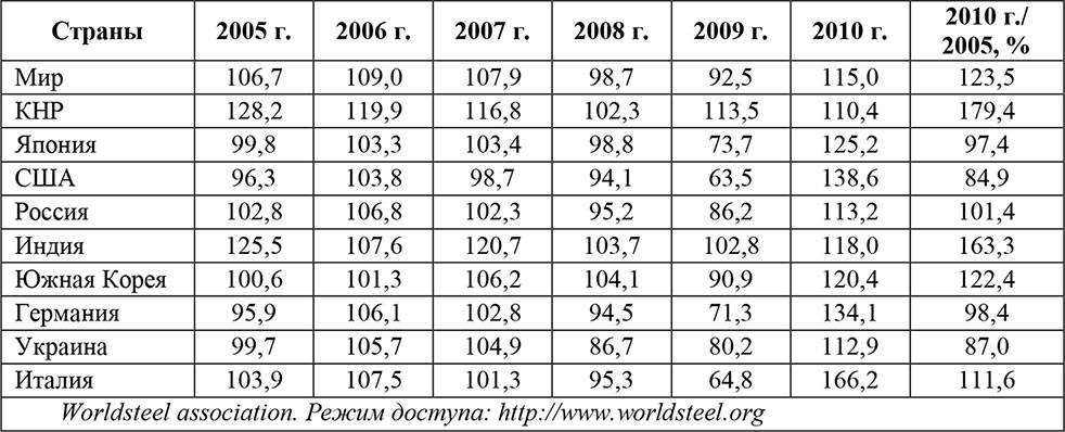 2010 – восстановительный рост. Мировое производство стали увеличилось на 15 %. Показатель стал рекордным для отрасли за всю историю. Все страны – крупнейшие производители стали продемонстрировали двузначные показатели роста (табл. 4).