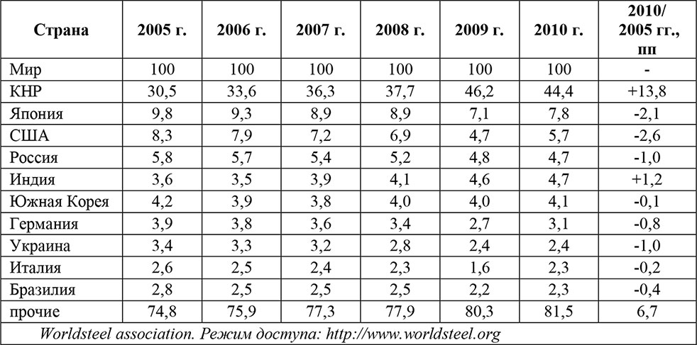 Мировым лидером по производству стали остался Китай, на долю которого приходится 44 % производства, следом за ним Япония, США, Россия и Индия (табл. 5).