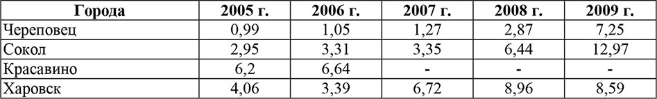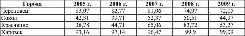 В Вологодской области к таким городам относятся: Череповец, Сокол, Красавино, Харовск. Экономика этих городов во многом ориентирована на выпуск продукции первичного передела, что налагает дополнительные риски и ограничения. Об этом свидетельствуют данные из таблицы.