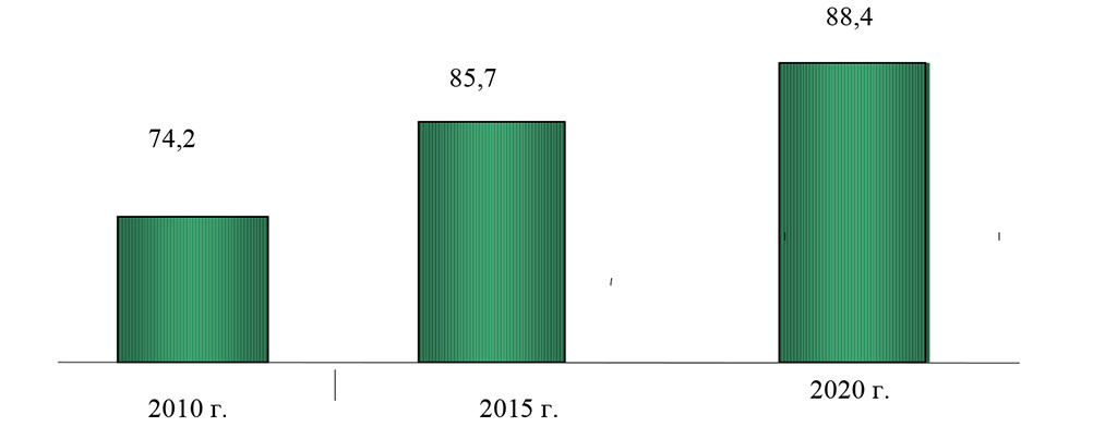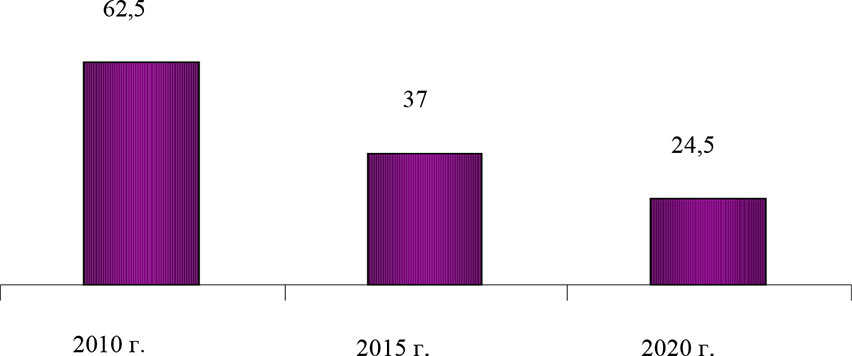 Рис. 1. Прогнозные значения доли градообразующих предприятий в общегородском объеме отгруженных товаров по Вологодской области, % [2]