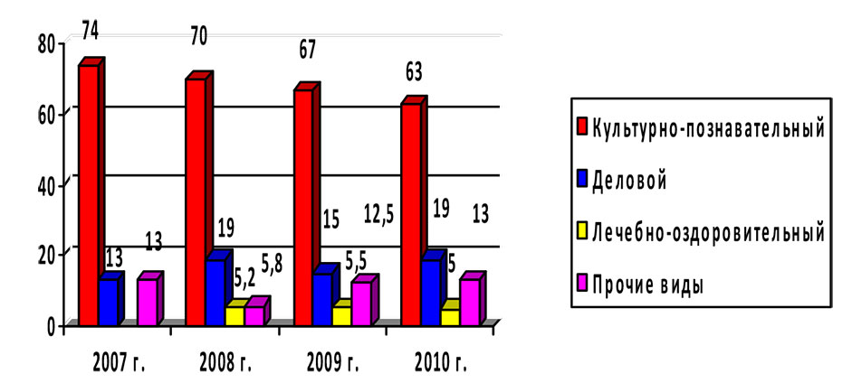 Как видно из рисунка 1, на протяжении последнего времени большая часть туристов посещает Вологодскую область именно с данной целью. [1]