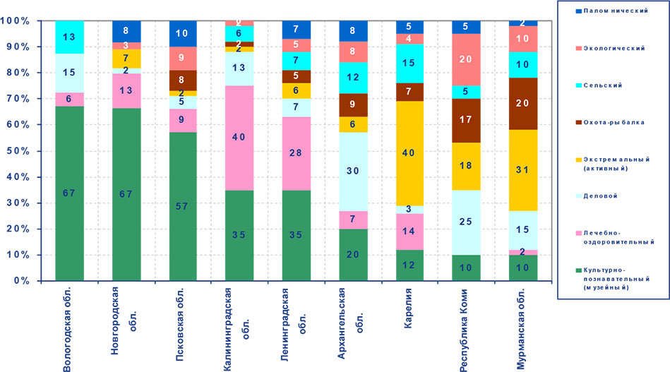 Рис. 2. Доля отдельных видов туризма среди регионов СЗФО в общем турпотоке в 2009 г., в %.