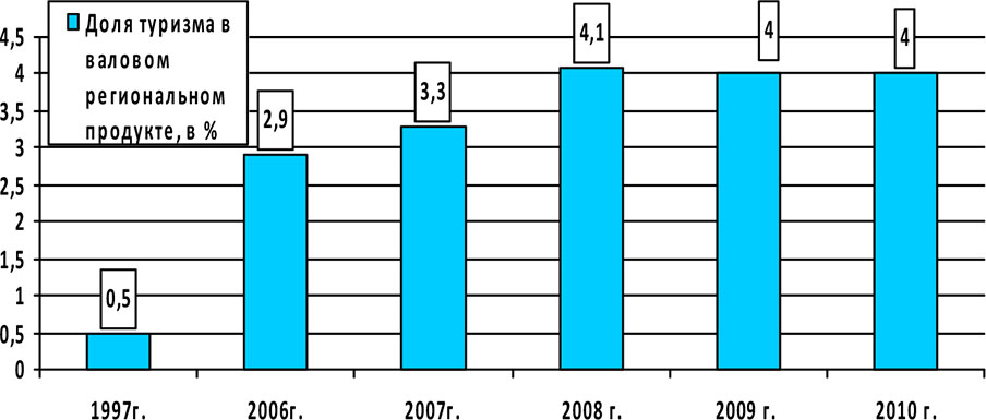 Туристская деятельность приносит реальный доход как субъектам турбизнеса, так и области. Как видно из рисунка 3, доля туризма в валовом региональном продукте возросла с 1997 г. по 2010 г. в 8 раз. [1]