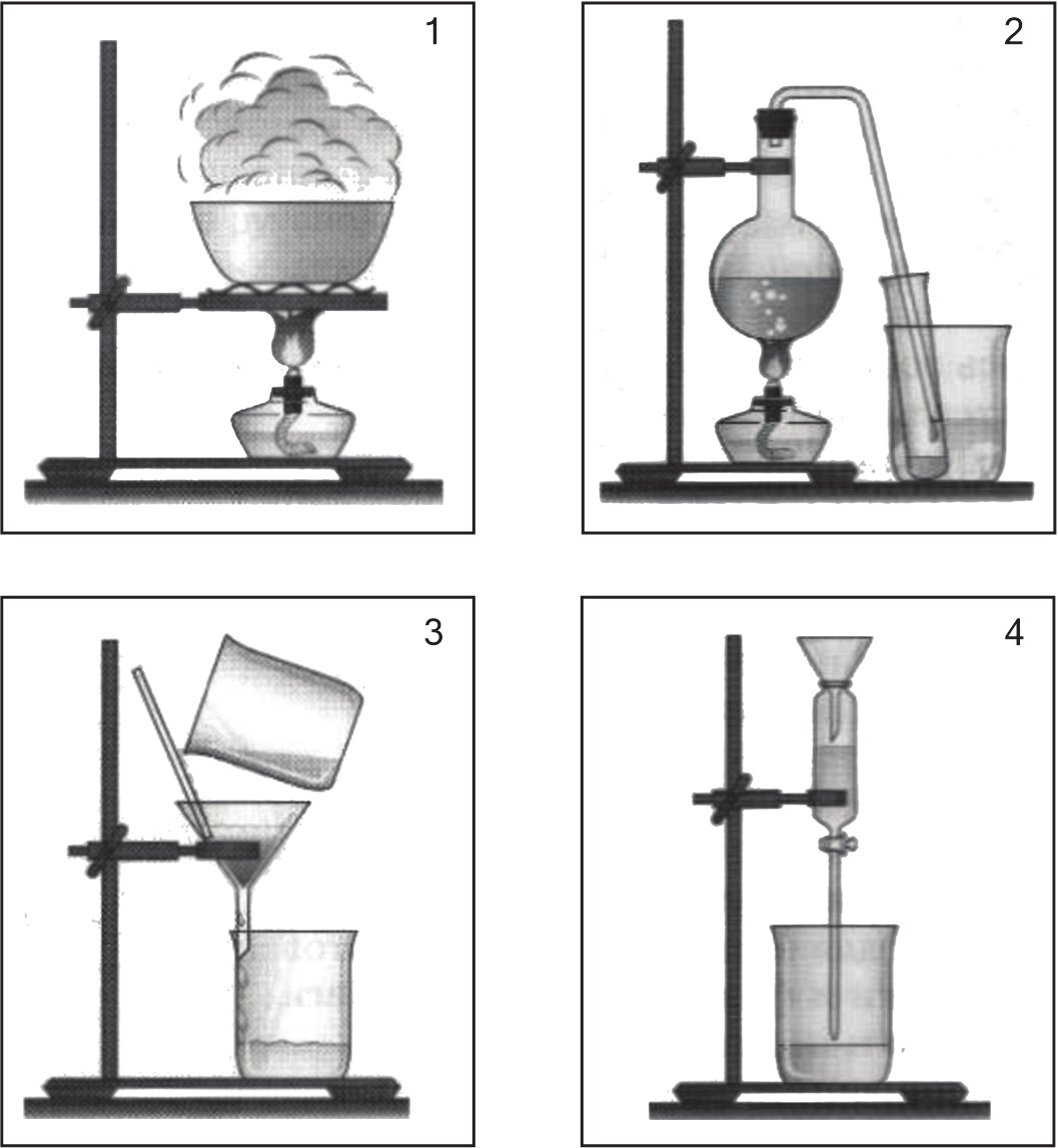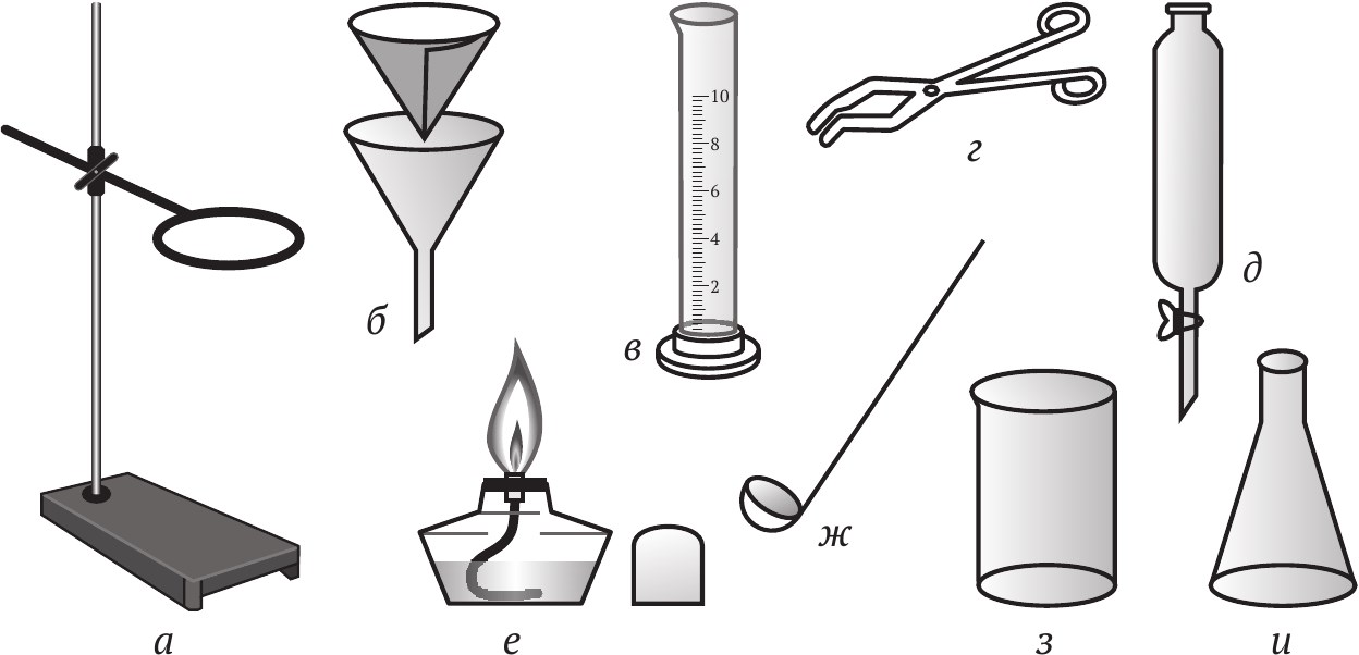 Отметьте на рисунке, какой посудой и каким оборудованием вы бы воспользовались для собирания прибора, с помощью которого можно отделить жидкость от нерастворимых в ней веществ [3, с. 21].