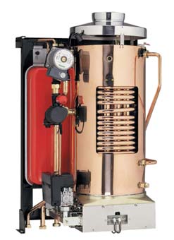 В комбинированных котлах водонагреватель конструктивно приближен к топочной камере и соединен с контуром трубопроводом циркуляции греющей воды.