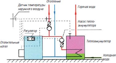 Для работоспособности данной конструкции кроме гидравлического соединения требуются циркуляционный насос, подающий греющую воду из котла в бойлер, и регулятор температуры, контролирующий заданную температуру воды в бойлере и дающий команду на отключение насоса, а также автоматика переключения в режим ГВС.