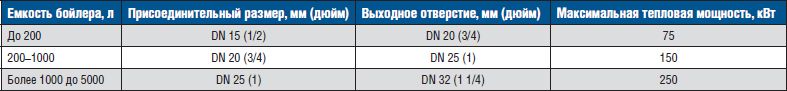 Таблица 6. Типоразмеры предохранительных клапанов для бойлеров ГВС