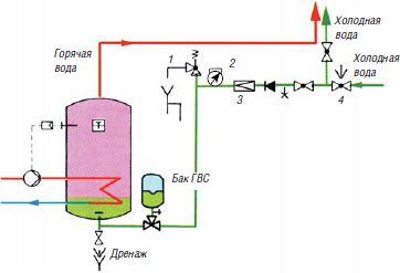 Рис. 7. Подключение бойлера: 1 – предохранительный клапан; 2 – манометр; 3 – обратный клапан; 4 – редуктор давления