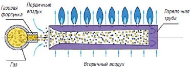 В атмосферных горелках первичный воздух для горения подсасывается за счет инжектирующей способности струи газа, выходящей из форсунки. Дополнительно необходимый для горения «вторичный» воздух подсасывается уже в зону факела для дожигания. Современные атмосферные горелки сконструированы так: из газового коллектора газ попадает через форсунки в перфорированные смешивающие трубки, в которых газ перемешивается с воздухом и уже после этого через перфорации подается в топку. При этом происходят интенсивное перемешивание и догорание молекул оксида углерода до СО2. Однако при таком горении в высокотемпературном пламени образуется большое количество токсичных оксидов азота NOх. Законодательства многих стран строго регламентируют такие выбросы. Для борьбы с данными загрязнениями пламя горелки делают «вытянутым» или охлаждают его корневую зону, помещая в нее рассекатели либо охладители пламени.