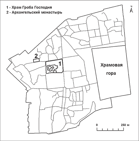 Упомянутое гумно Орны Иевусеянина – это то место, которое купил Давид и на котором Соломон позже построил Храм. Но примерно на 700 м к северу от Храмовой горы, на улице св. Франциска есть монастырь Архангела Михаила, названный в честь ангела, явившегося Давиду. Недалеко отсюда находится Голгофа – христианский центр мира, к которому стягиваются все библейские события в их христианском понимании. Так, рядом с Голгофой христиане традиционно указывают место, где Авраам намеревался принести в жертву Исаака – в монастыре Св. Авраама, входящего в комплекс Храма Воскресения. Здесь же, в Архангельском монастыре, или в монастыре Св. архангела Михаила (поскольку в христианской традиции упомянутый в книге Паралипоменон ангел ассоциируется с архангелом Михаилом) показывают место его явления Давиду. В общем, здесь можно сказать, что мы находимся на альтернативной Храмовой горе.