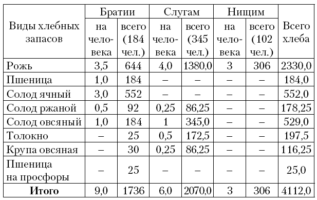 Публикуемые ниже хозяйственные материалы Кирилло-Белозерского монастыря позволяют воссоздать организацию «хлебного хозяйства» и обеспечения хлебом не только монахов, но и многочисленных слуг, служебников, мастеровых, нищих и прочих людей в одной из прославленных обителей Русского Севера.