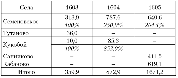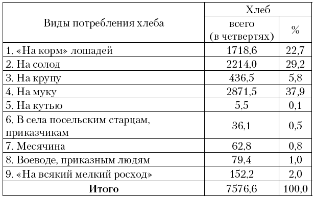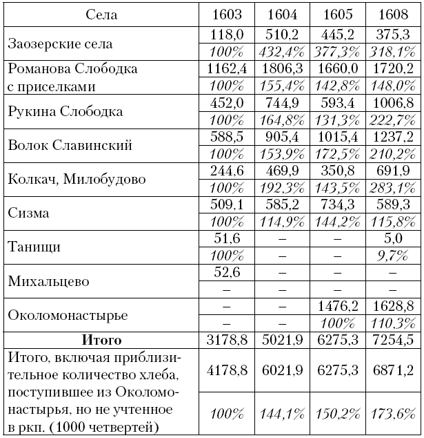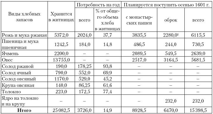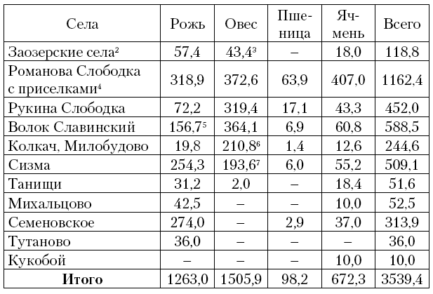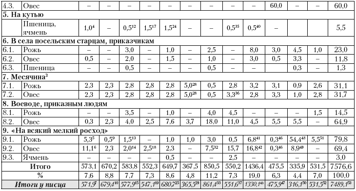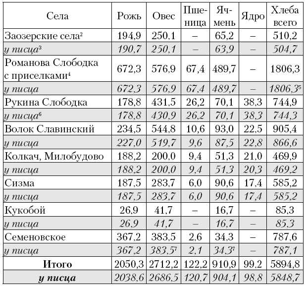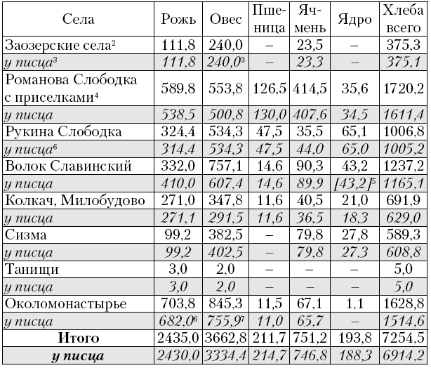 5 У писца в итоге (1600,3 четверти) не включены сведения о поступлениях хлеба из села Троицкого (л. 25, 25 об.); при этом общая сумма принятого зерна из Романовой Слободки полностью совпала с нашими подсчетами.