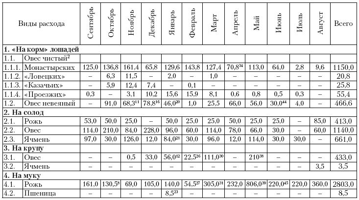 25 В ркп. л. 38 об., 39; возможно, расхождение наших подсчетов объясняется тем, что в записях по дням переписчик пропустил 30 четвертей ячменя на солод «в солодежню».