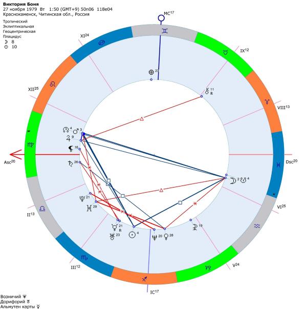 Это карта Бони, она всегда расчетливо подходила к своим отношениям и жизни, искала рациональной выгоды во всем, соблюдала режим питания и диету, могла бы починить запросто тачку, что помогло ей проявить себя в телевизионных программах по СУ в 12-м доме, но, видимо, она переусердствовала с расчетливостью, потому что миграция к океану кончилась разводом и возвращением. Может быть, для супруга она оказалась недостаточно скромной и чистой, примерной женой, чего требует ЮУ в 6-м доме.