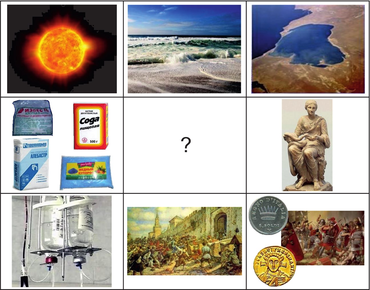 1. Солнце. 2. Море. 3. Кара-Богаз-Гол – соленое озеро Кара-Богаз-Гол. 4. Салюс – богиня у древних римлян. 5. В Италии «сольди», во Франции «солид» и французское слово «салер» – «жалованье». 6. Московское восстание 11 июня 1648 г. позже назовут этим бунтом. 7. Физиологический раствор. 8. Представители этого класса соединений.
