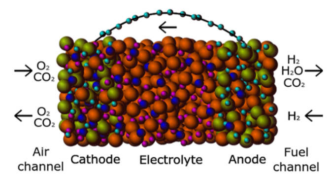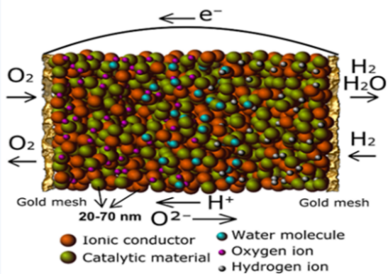 Figure 1: up) Traditional 3-layer ceramic nanocomposite fuel cell; down) so called “single-layer” ceramic fuel cell.
