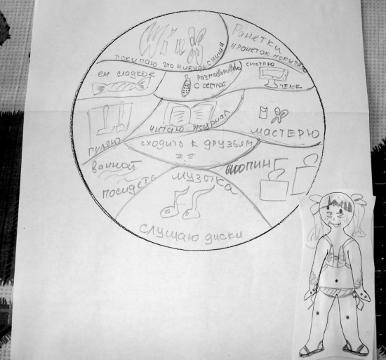 Далее учащимся было предложено «спасти человечка», то есть предложить пути его «выведения» из того состояния, которое связано со стрессом. Для этого им раздали листы бумаги формата А4 с заранее нарисованным на них кругом. Автором была дана небольшая информационная справка о том, что форма круга издавна была для людей символом гармонии, единства и целостности. Учащимся было дано задание при помощи соответствующих образов изобразить в круге все то, что может спасти человечка в трудной ситуации, способы выхода из этой ситуации.