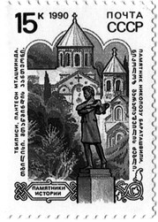 Парная структура была мной замечена и в изобразительном искусстве. В качестве примера можно привести одну почтовую марку советского времени, на которой изображен памятник грузинскому романтику Николозу Бараташвили. Его силуэт, одежда, кудрявые волосы наталкивают на ассоциацию с памятником А. С. Пушкину в Санкт-Петербурге на площади Искусств.