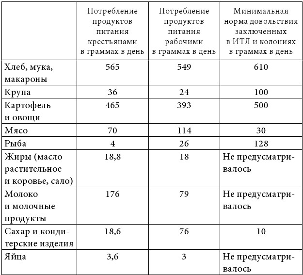 Как видно из таблицы, рацион питания «свободного» населения, в первую очередь крестьян, по своей структуре и объемам вплотную приближался к нормам, предусмотренных для заключенных. Эта тенденция наблюдалась и в последующие годы.