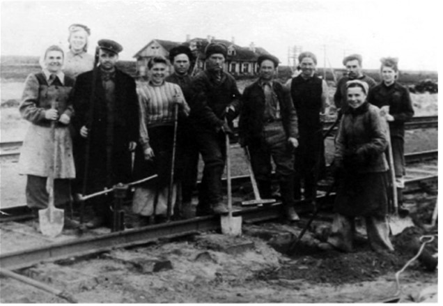 Рис. 1.2. Заключенные и вольнонаемные работники на месте строительства железной дороги Чум – Лабытнанги, 1954 (Общество «Мемориал»)