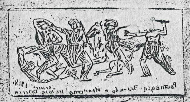 Причём бесстрашно нападают на всадников явно пехотинцы, вооружённые, на мой взгляд, мечами из бронзы. Хотя по логике должно быть наоборот, а всадники, обороняясь, отступают. Может быть, они и вовсе действуют сообща против врага, изображение которого не попало на рисунок. Сюжет интересный и даже, можно сказать, захватывающий. Древнему художнику удалось передать весь накал страстей этой яростной схватки. Не удивительно, что Герье-историк использовал его для своего владельческого экслибриса. Предполагаю, что это этрусские воины (I-е тыс. до н.э.). Надпись, как в своей работе «Научное движение в области древнейшей Римской истории» указывает В.И.Герье, возможно, сделана на карфагенском или финикийском языке. Глядя на этот экслибрис, ещё есть, над чем поразмышлять…