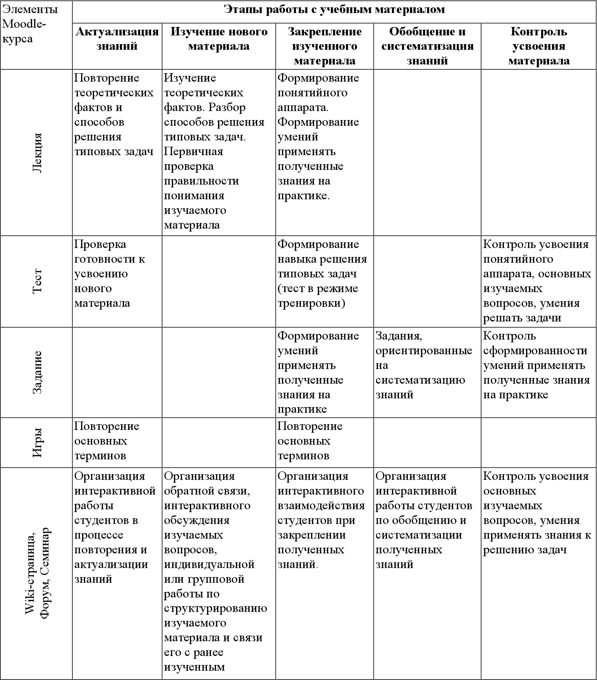 Для результативного внедрения данного подхода все интерактивные элементы СДО MOODLE должны использоваться с учетом их дидактических возможностей [1].