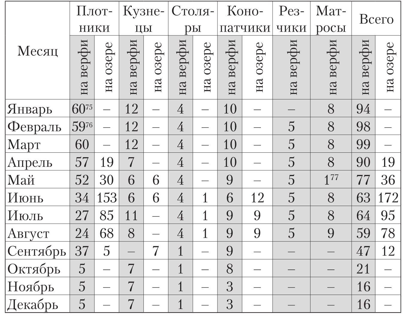 Летом 1712 г., когда отделка шняв уже подходила к концу, число мастеровых в Новой Ладоге стало постепенно сокращаться. Судя по записям расходной книги, плотники и кузнецы в селе Черном несколько месяцев работали «у подъему судов». Так, в апреле на Ладожском озере «у подъему карабля» вместе с Ф. П. Пальчиковым находилось девятнадцать плотников177. В мае «у подъемных судов» в селе Черном вместе с плотниками уже трудилось шесть кузнецов. В следующем месяце выплачивалось жалованье плотникам, кузнецам и столяру, которые также пребывали в Черном «у подъема корабля»178. Согласно данным расходной книги, в июне там находились ярославские, ржевские и олонецкие плотники, которым выдавали по рублю человеку в месяц179. Однако только незначительная часть мастеровых была направлена в село Черное из Новой Ладоги. По-видимому, необходимое для ремонта корабля число работников прислало Петербурское адмиралтейство.