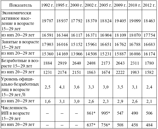 2) основная занятость среди молодых граждан в 2012 году соответствует возрасту 20–29 лет: так, среди них трудоустроено 226 из 1000 занятых граждан; этот показатель выше уровня аналогичного показателя 1992 года на 10 человек;