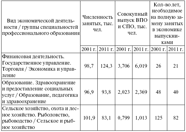Выпуск 2001 года для сельского, лесного и рыбного хозяйства составлял лишь 0,8 % от числа занятых в данной отрасли, когда для полного воспроизводства рабочей силы требуется не менее 2,5 % (при средней продолжительности занятости в отрасли ― 40 лет). Получается, что работникам, выходящим на пенсию, просто некому передавать профессиональный опыт, и в итоге отрасль «сужается». Это подтверждается сокращением за 2001–2011 годы численности занятых в сельском, лесном и рыбном хозяйствах на 18,5 %. Период обновления кадров за средний период трудовой деятельности человека (35–40 лет) превышен по обрабатывающим производствам (302 года!), строительству (70 лет), производству и распределению энергии, газа и воды (66 лет).