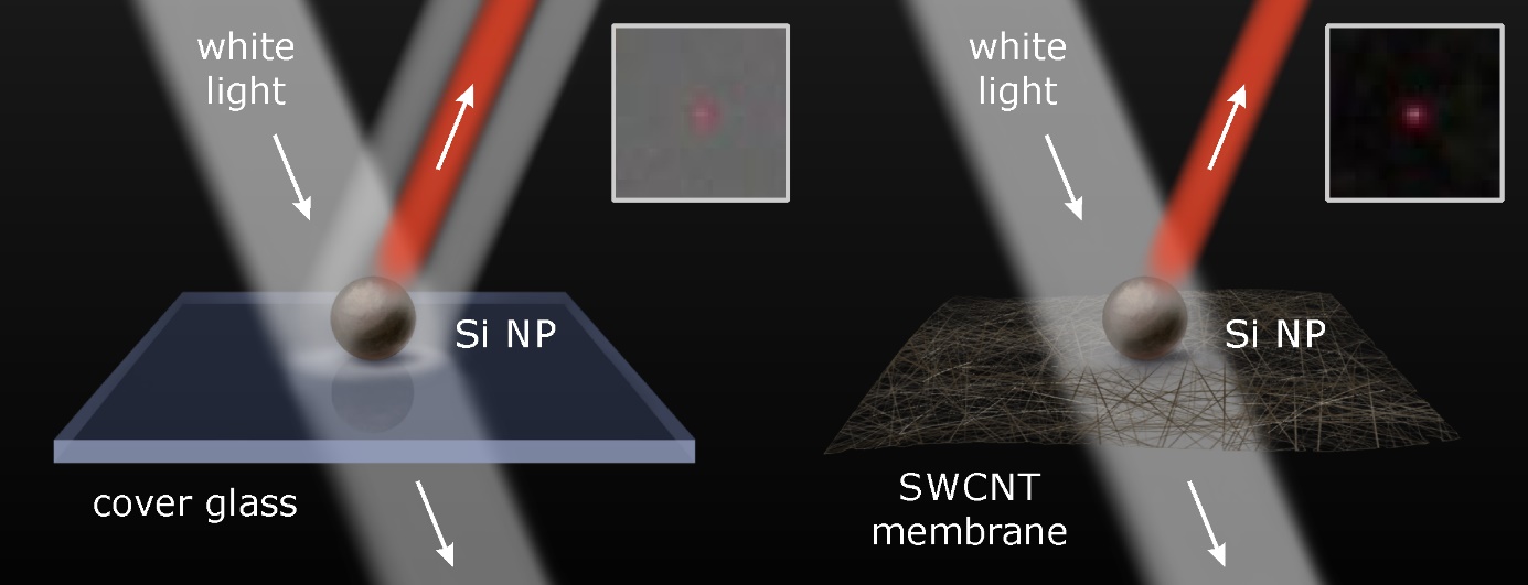 Fig. 1. Proof-of-concept demonstration of bright-field optical microscope image contrast enhancement using 200 nm Si nanoparticles (Si NP) transferred on a cover glass (left) and SWCNT membrane (right).