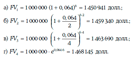Пример 1.1. Денежная сумма в 1 млн долл. инвестирована на 6 лет под годовую процентную ставку 6,4 %. Определим будущую стоимость инвестиции, если проценты начисляются: а) один раз в год; б) дважды в год; в) ежеквартально; г) непрерывно: