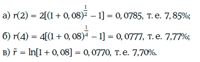 Пример 1.2. Банк предлагает по депозитам годовую процентную ставку в 8 % при начислении процентов один раз в год. Какую годовую процентную ставку можно требовать при начислении процентов: а) дважды в год; б) ежеквартально; в) непрерывно?