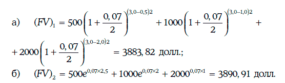 Какова будущая стоимость денежного потока через 3 года, если инвестор предполагает инвестировать поступающие денежные суммы под 7 % при начислении процентов: а) дважды в год; б) непрерывно?