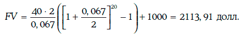 Пример 1.4. Менеджер покупает облигацию, по которой выплачиваются проценты в размере 40 долл. каждые полгода в течение 10 лет и номинальная стоимость в 1000 долл. в конце десятого года. Определим будущую стоимость инвестиции через 10 лет, если все платежи реинвестируются под 6,7 %, а первый процентный платеж производится через 6 месяцев.