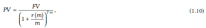 Процентную ставку r(m), используемую для определения приведенной стоимости инвестиции, называют ставкой дисконтирования (discount rate). Если ставка дисконтирования определяется при непрерывном начислении процентов, то формула (1.10) принимает вид: