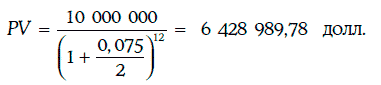 Пример 1.5. Менеджер пенсионного фонда должен через 6 лет выплатить 10 млн долл. В данный момент менеджер имеет возможность инвестировать любую сумму под 7,5 % при начислении процентов дважды в год. Сколько должен инвестировать менеджер пенсионного фонда, чтобы выполнить свое обязательство?
