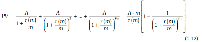 Если денежный поток представляет собой обыкновенную ренту, по которой т раз в год в течение Т лет выплачивается одна и та же денежная сумма А, то приведенная стоимость такой ренты может быть найдена следующим образом: