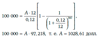 Пример 1.7. Банк согласился предоставить 30-летний ипотечный кредит в размере 100 000 долл. По условиям ипотечного кредитования ежемесячные платежи заемщика должны быть одинаковыми. Годовая процентная ставка, требуемая банком, равна 12 %. Какова величина ежемесячного платежа заемщика?