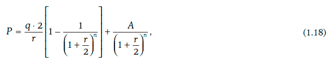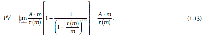 Обыкновенную ренту называют бессрочной[14] (perpetual annuity), если поток рентных платежей не ограничен по времени. Приведенная стоимость бессрочной ренты, по которой m раз в год выплачивается сумма А, может быть найдена следующим образом: