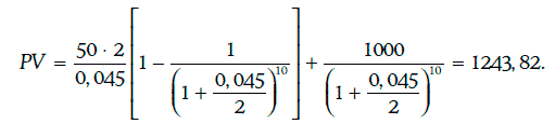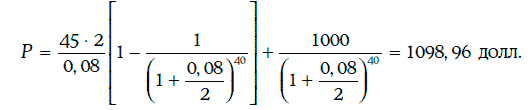 Пример 1.11. Найдем цену 9 %-ной купонной облигации, номинальной стоимостью 1000 долл., когда до ее погашения остается 20 лет, а требуемая доходность составляет 8 %.